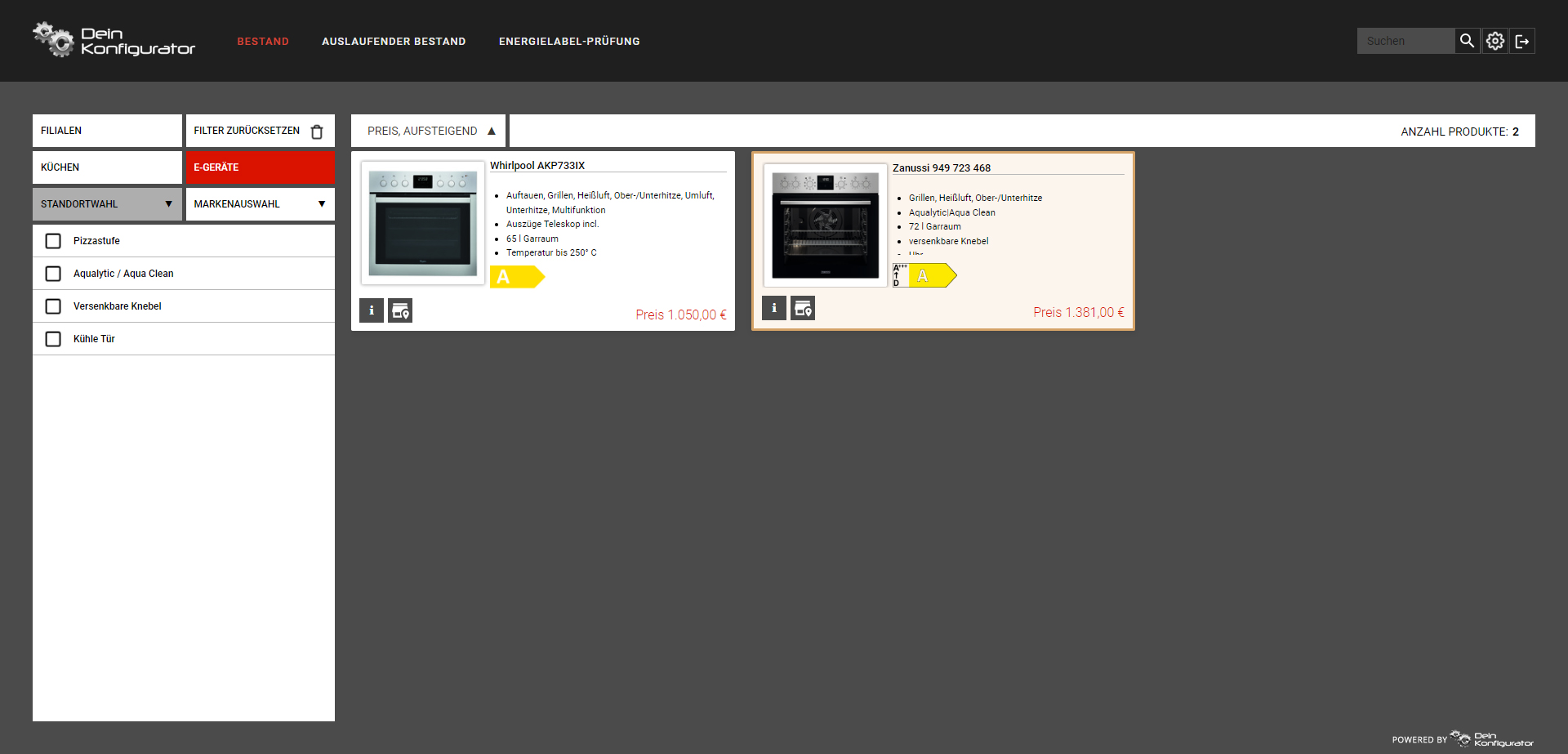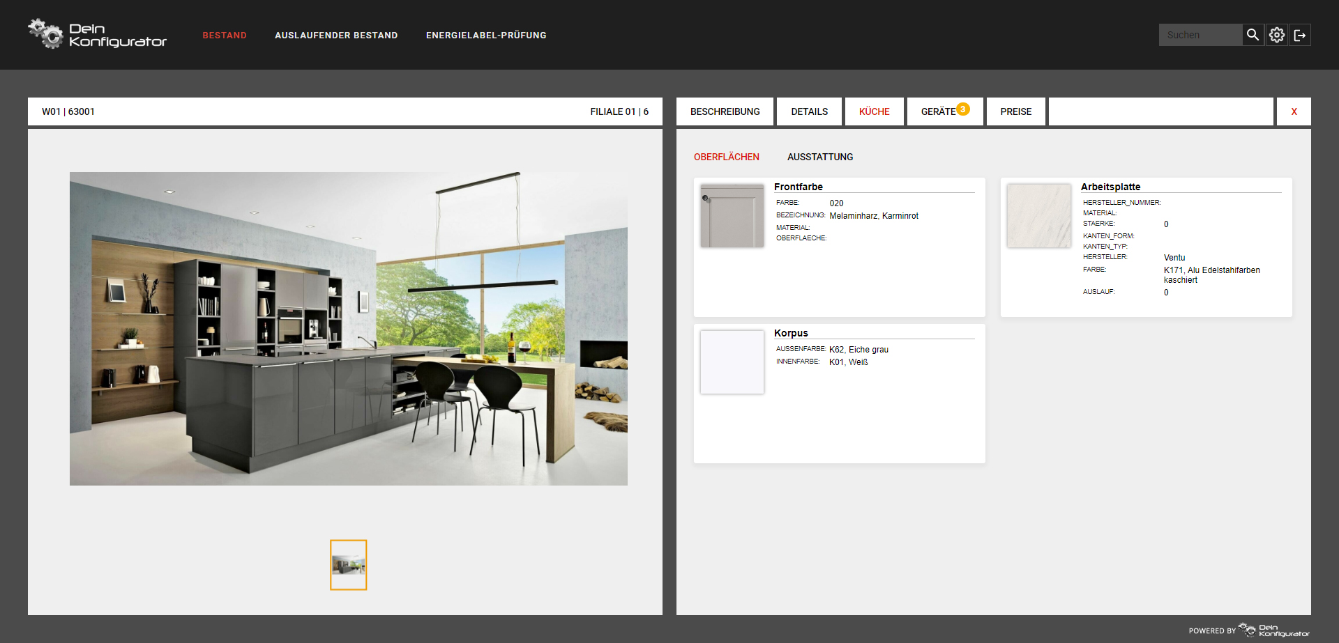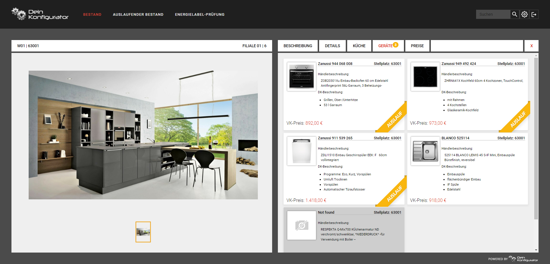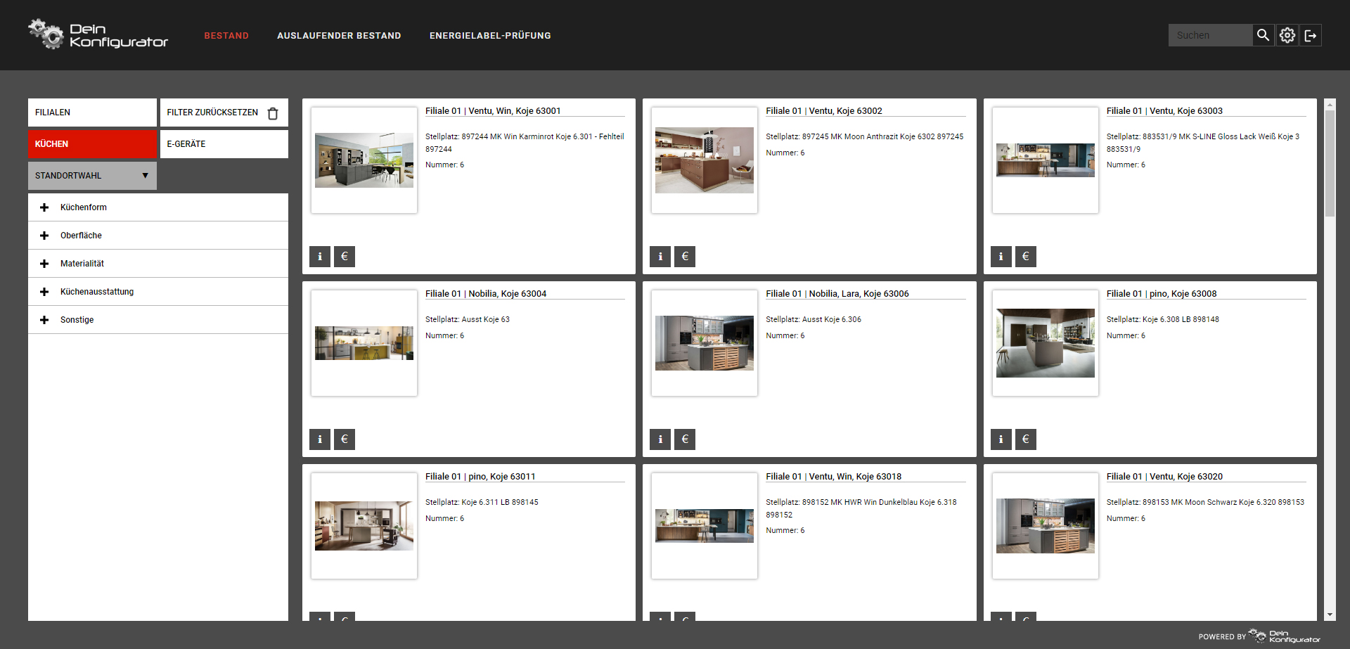 Wie sind die Küchen in Filiale A zusammengestellt ? Worin unterscheiden sich die Ausstattungen in Filiale B? Welche E-Geräte gibt es in Filiale C ? Genau dies beantwortet der Ausstellungsnavigator: er verschafft sofort einen Überblick über die Merkmale aller Ausstellungsstücke in all Ihren Filialen.