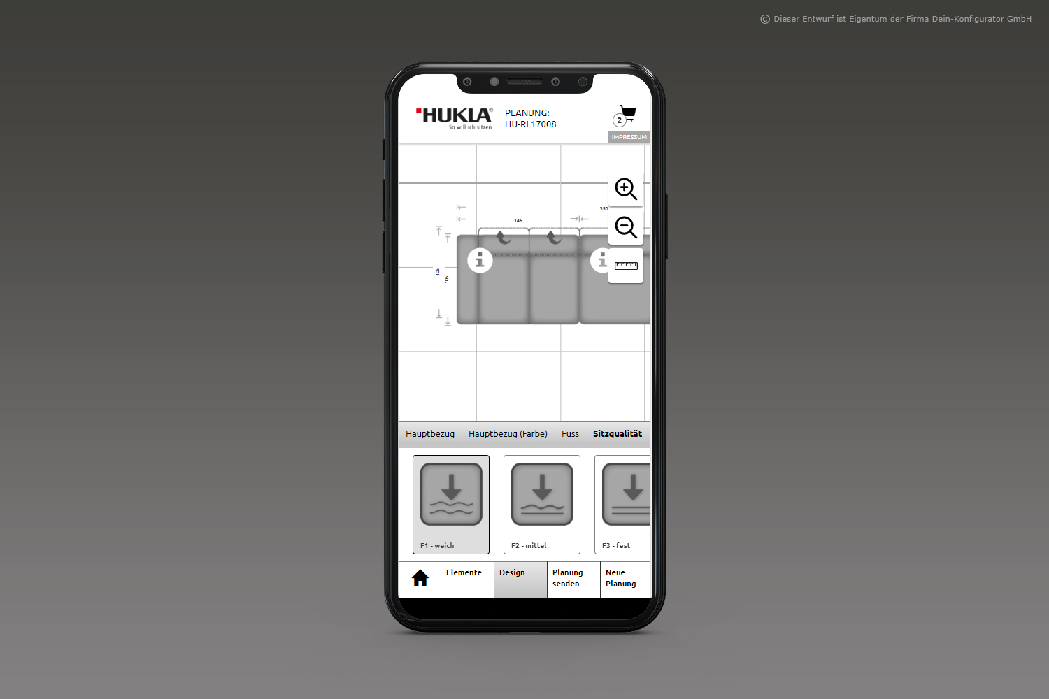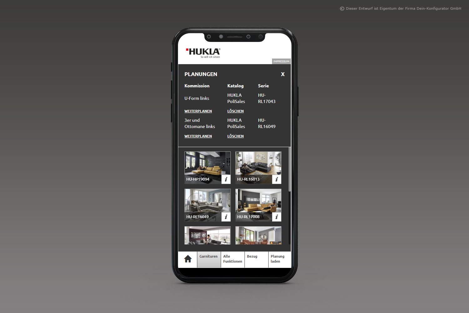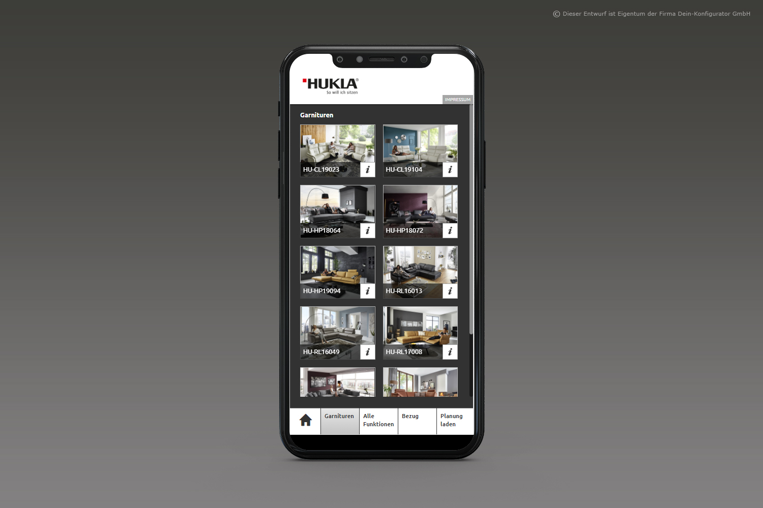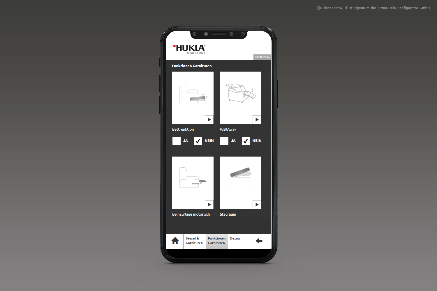 Man nehme: Form, Funktion, Stoff oder Leder– fertig ist das individuelle Polstermöbel. KundInnen sehen beim Planen alle möglichen Funktionen aller Lieferanten mittels Videos, Zeichnungen und Texten; sie erhalten eine Warenkunde der Stoff- und Lederklassen und den direkten Preisvergleich über alle Preisgruppen bzw. die Preise von Mehrausstattungen. Das so entstandene Möbelstück wird im bebilderten Warenkorb festgehalten und als 2D-Bild wie auch als 3D-Bild dargestellt.