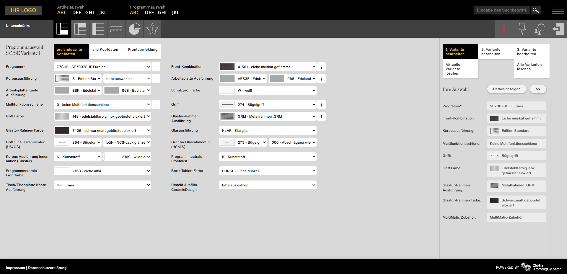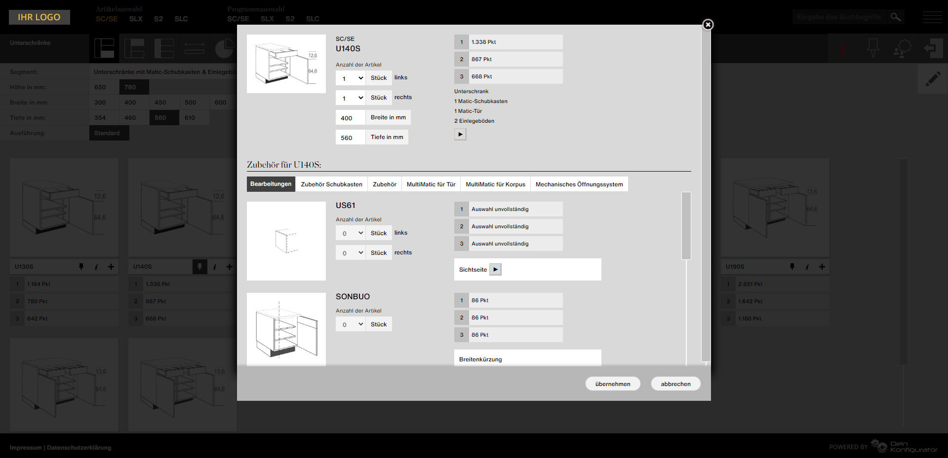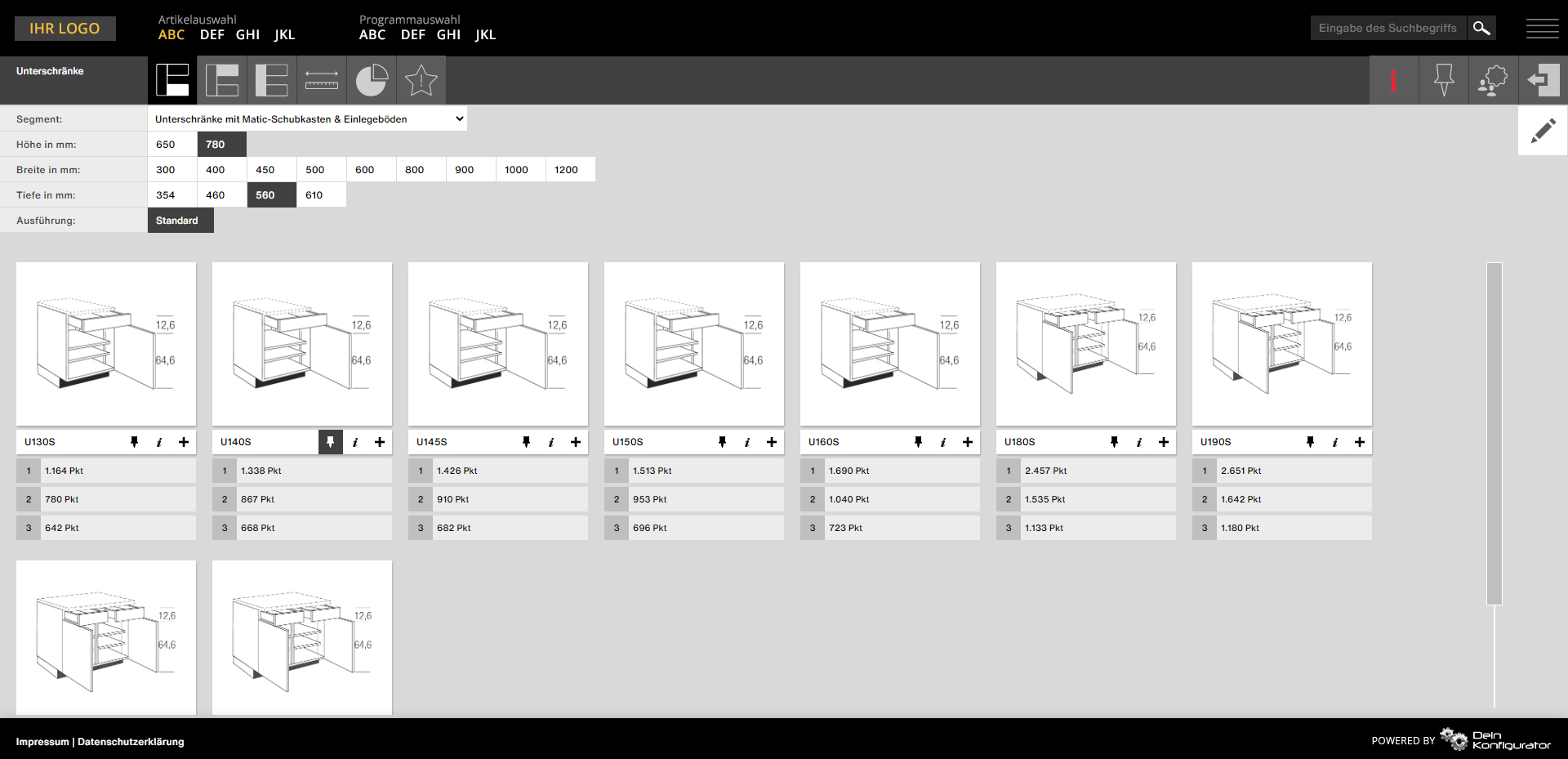 - Individuelle Konfigurationsoptionen und Einstellungen pro Partner, z.B. variable Anzeige der Küchen nach Punkten, EK- oder VK-Preisen