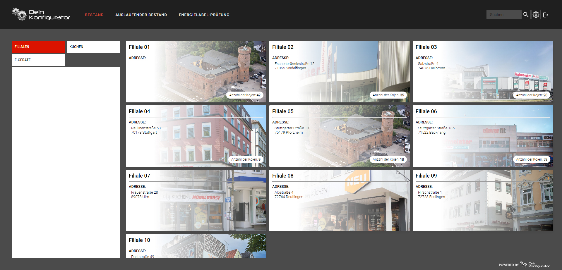 Wie sind die Küchen in Filiale A zusammengestellt ? Worin unterscheiden sich die Ausstattungen in Filiale B? Welche E-Geräte gibt es in Filiale C ? Genau dies beantwortet der Ausstellungsnavigator: er verschafft sofort einen Überblick über die Merkmale aller Ausstellungsstücke in all Ihren Filialen.