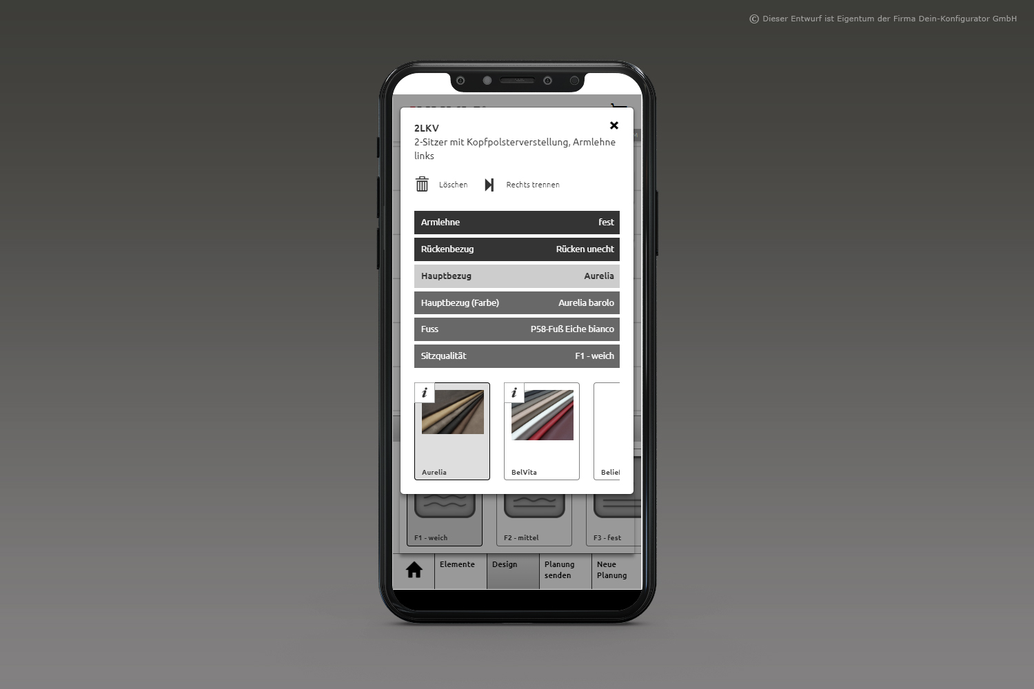 Man nehme: Form, Funktion, Stoff oder Leder– fertig ist das individuelle Polstermöbel. KundInnen sehen beim Planen alle möglichen Funktionen aller Lieferanten mittels Videos, Zeichnungen und Texten; sie erhalten eine Warenkunde der Stoff- und Lederklassen und den direkten Preisvergleich über alle Preisgruppen bzw. die Preise von Mehrausstattungen. Das so entstandene Möbelstück wird im bebilderten Warenkorb festgehalten und als 2D-Bild wie auch als 3D-Bild dargestellt.